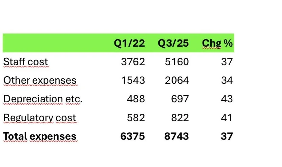 All major expense categories are up by more than 30%, and since Q3 2024 the bank has posted negative operating leverage—costs rising faster than income, pressuring profits.